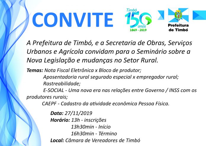 A Prefeitura de Timbó, por meio da Secretaria de Obras, Serviços Urbanos e Agrícola, em parceria com o Conselho Municipal de Desenvolvimento Rural e Sindicato dos Produtores Rurais de Timbó, vai realizar o Seminário sobre a Nova Legislação e mudanças no Setor Rural, para esclarecer aos interessados todas as dúvidas sobre o que está acontecendo nesse sentido em âmbito nacional, especialmente de ordem fiscal, que demanda mais atenção dos produtores rurais. O Seminário será no dia 27 de novembro, na Câmara de Vereadores de Timbó, tendo início às 13 horas com as inscrições dos participantes e término previsto para às 16h30min.