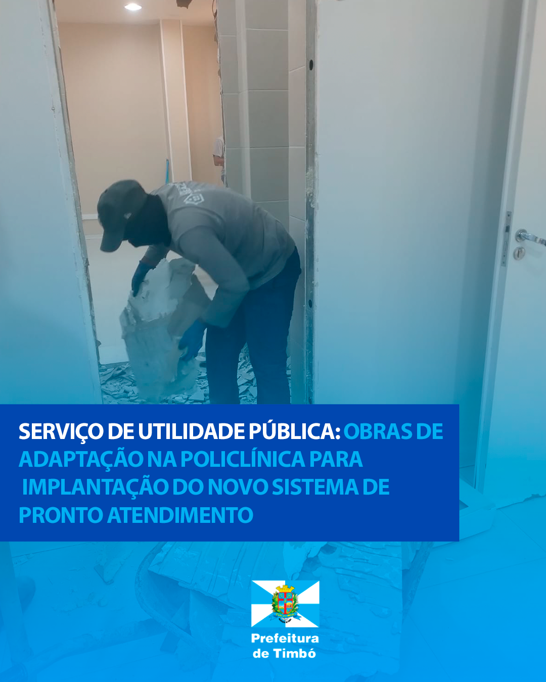 A Prefeitura de Timbó, por meio da Secretaria Municipal de Saúde, informa que estão em andamento as obras de adaptação na Policlínica, em preparação para a implantação do novo sistema de Pronto Atendimento, que entrará em operação a partir do dia 1º de maio de 2025.