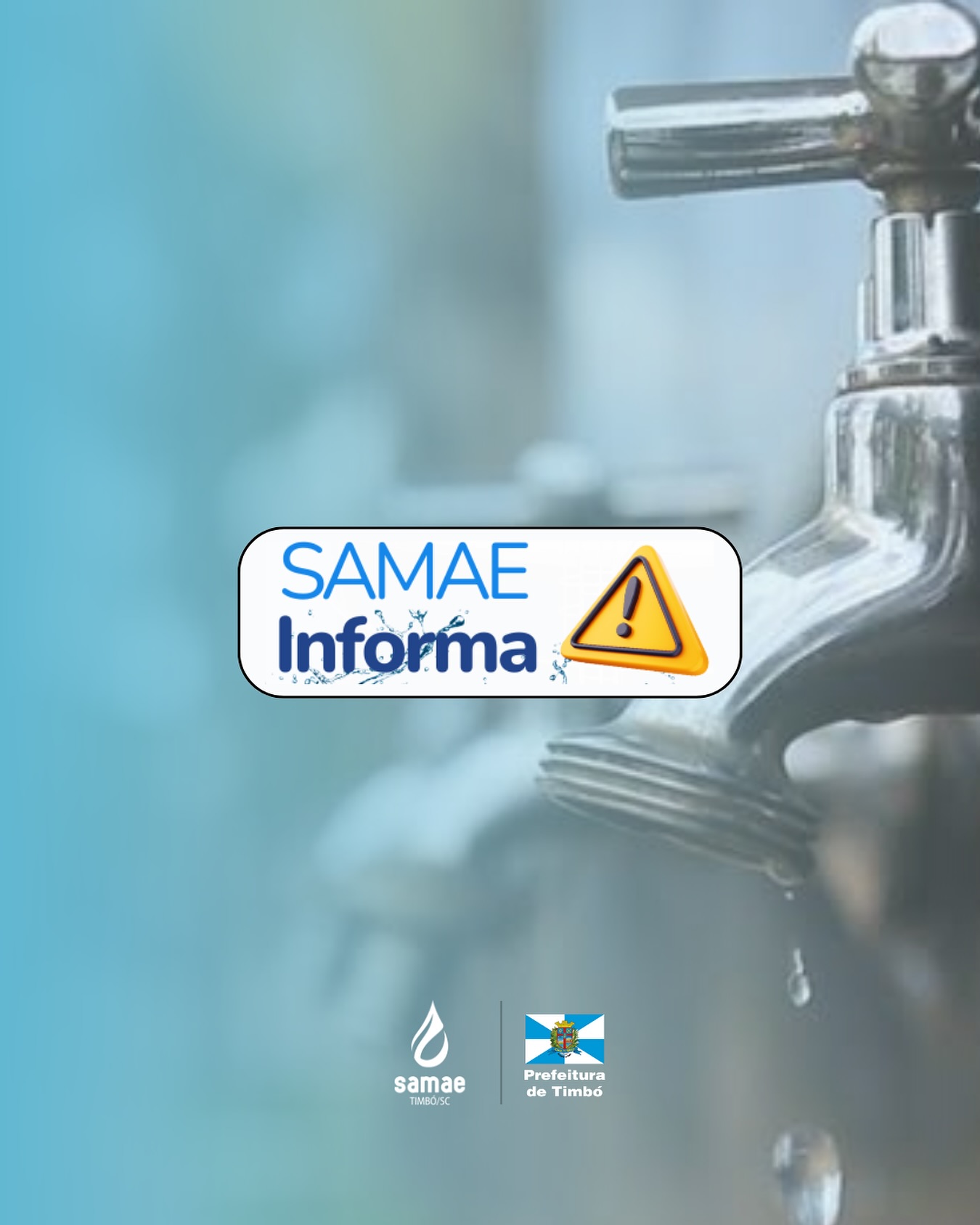 A Prefeitura de Timbó, por meio do SAMAE, informa que nesta terça-feira, dia 13 de maio, haverá interrupção no abastecimento de água em parte do Bairro das Nações, devido à realização de obras de manutenção e melhorias na rede de distribuição.