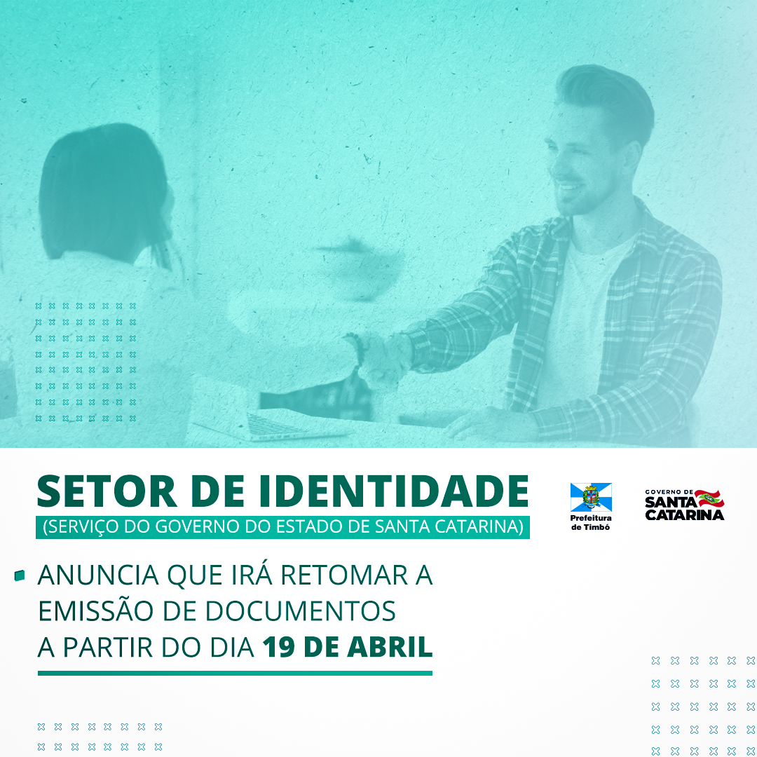 O Setor de Identidade, que é um serviço do Governo do Estado de Santa Catarina, informa que a emissão de documentos será retomada a partir do dia 19 de abril devido à transição do sistema, sendo que nesse período os funcionários estarão passando por capacitação para a implementação do novo sistema e para melhor atender à comunidade.