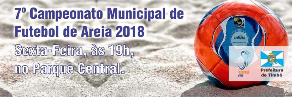 Vai começar mais um Campeonato Municipal de Futebol de Areia de Timbó. É a 7ª edição da competição, que reúne todos os anos diversas equipes e um público fiel. Todas as partidas ocorrem durante à noite, no campo do Parque Central. O campeonato começa nesta próxima sexta-feira, dia 16, às 19h. Três categorias estarão disputando o título: Livre, Veteranos e Sub15. Mais informações no site da FME em fme.timbo.sc.gov.br, ou pelo telefone 3382-3689.