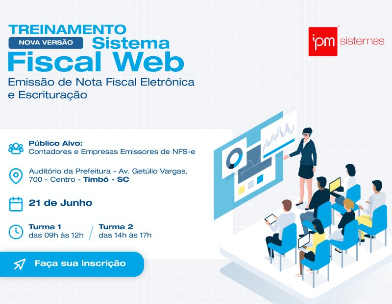A Prefeitura de Timbó, através da Secretaria de Fazenda e Administração, informa que o software do sistema Fiscal Web passará por mudanças para uma nova versão. É nele que são emitidas Notas Fiscais de Prestação de Serviço eletrônicas e também o envio das Declarações de ISS – Serviços Prestados e Serviços Tomados no município.