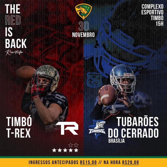 O Complexo Esportivo de Timbó voltará a respirar futebol americano na tarde do próximo sábado, dia 30 de novembro de 2019. O T-Rex irá enfrentar o Tubarões do Cerrado (DF), em partida válida pela semifinal da Liga BFA Elite 2019. O vencedor desse confronto, que tem o kickoff (chute inicial) marcado para às 15h, garante um lugar no Brasil Bowl 2019, que é a final do principal campeonato da modalidade no Brasil.