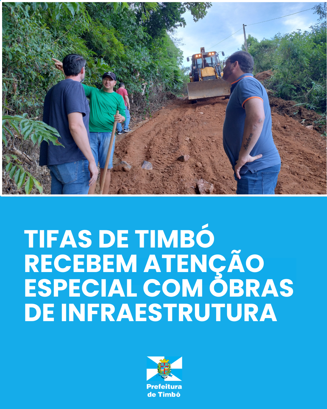 Tifas de Timbó recebem atenção especial com obras de infraestruturaA Prefeitura de Timbó está intensificando os trabalhos de manutenção e melhorias nas localidades do interior do município. Pelo menos 10 frentes de trabalho já foram entregues, como as vias de Rio Fortuna, Tiroleses, Cedrinho, Bom Jesus, Tifa Sprung, Tifa Krieser, além de outras no bairro Araponguinhas e Nações.