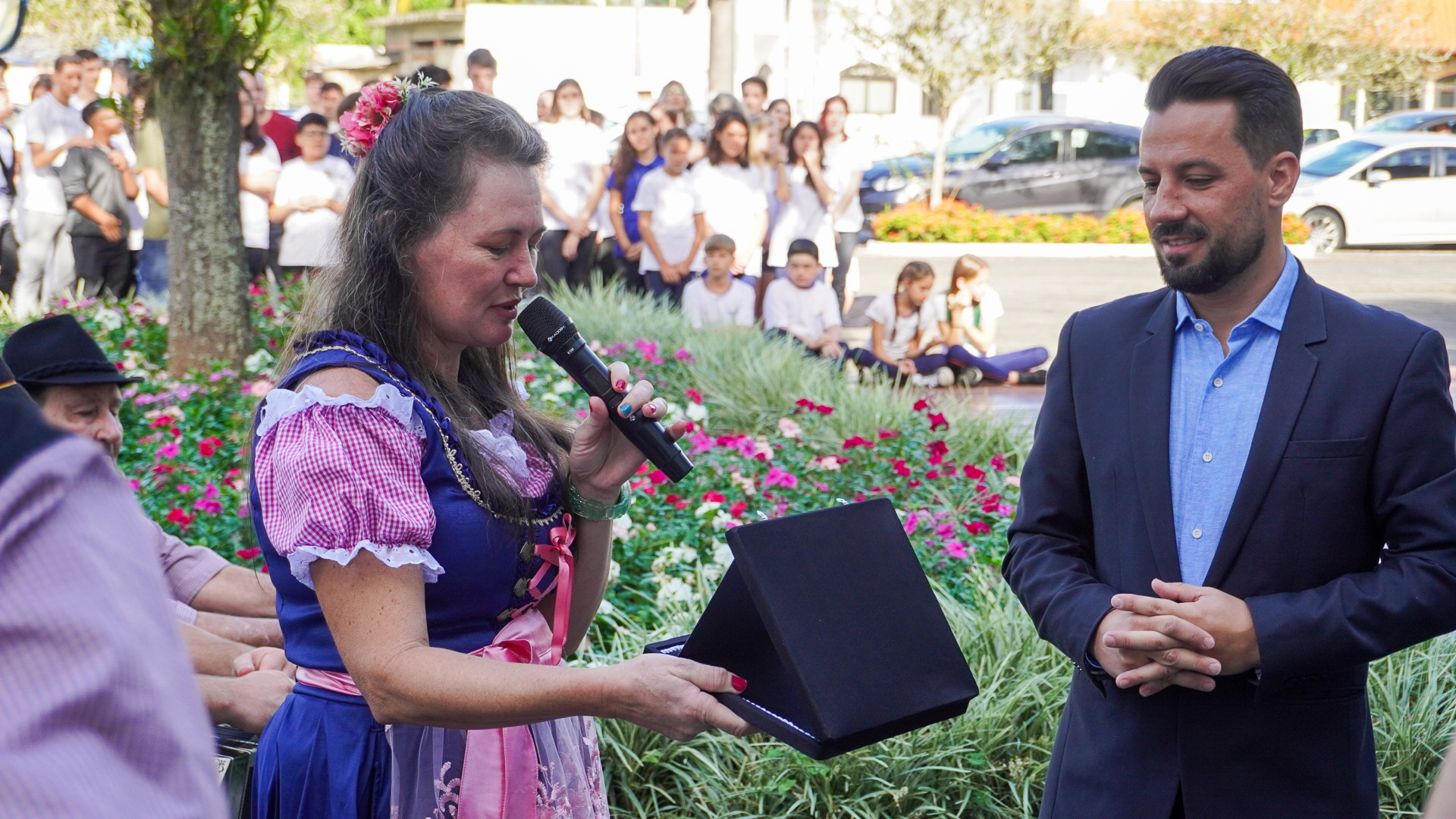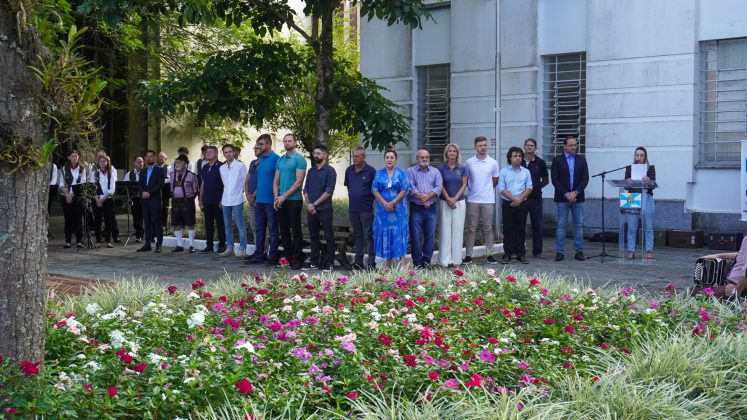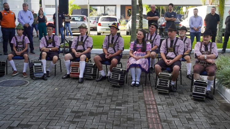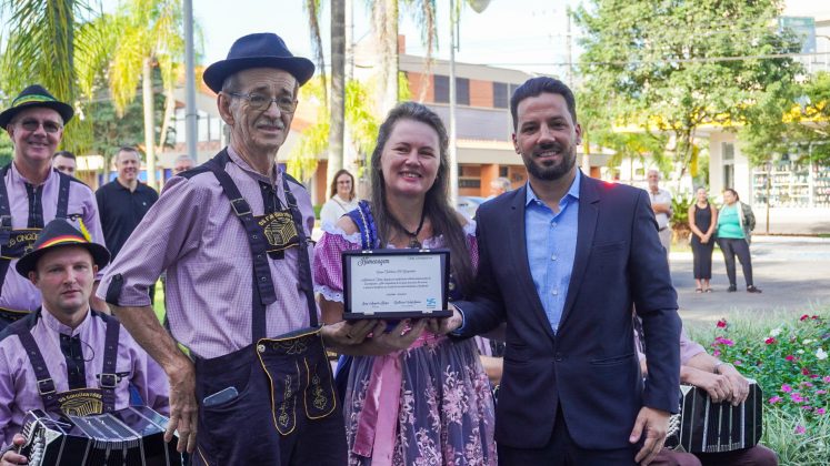 O Grupo recebeu do prefeito Jorge Krüger uma placa de homenagem e agradecimento por suas contribuições à cultura e história de Timbó.