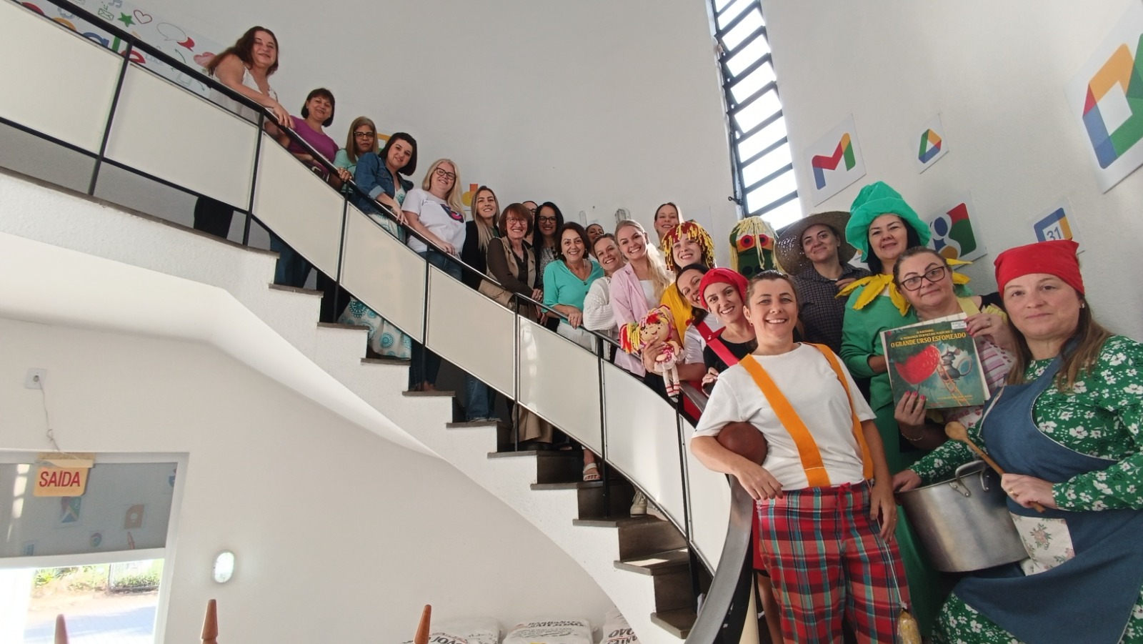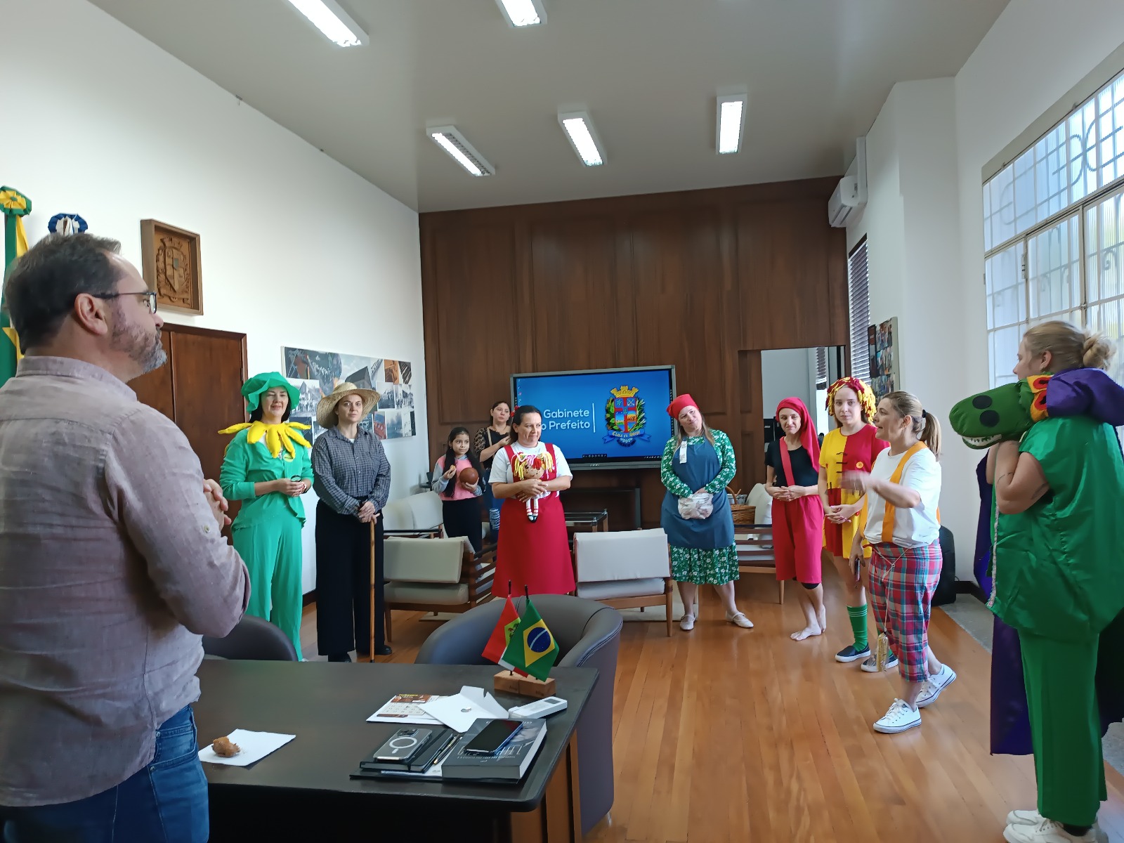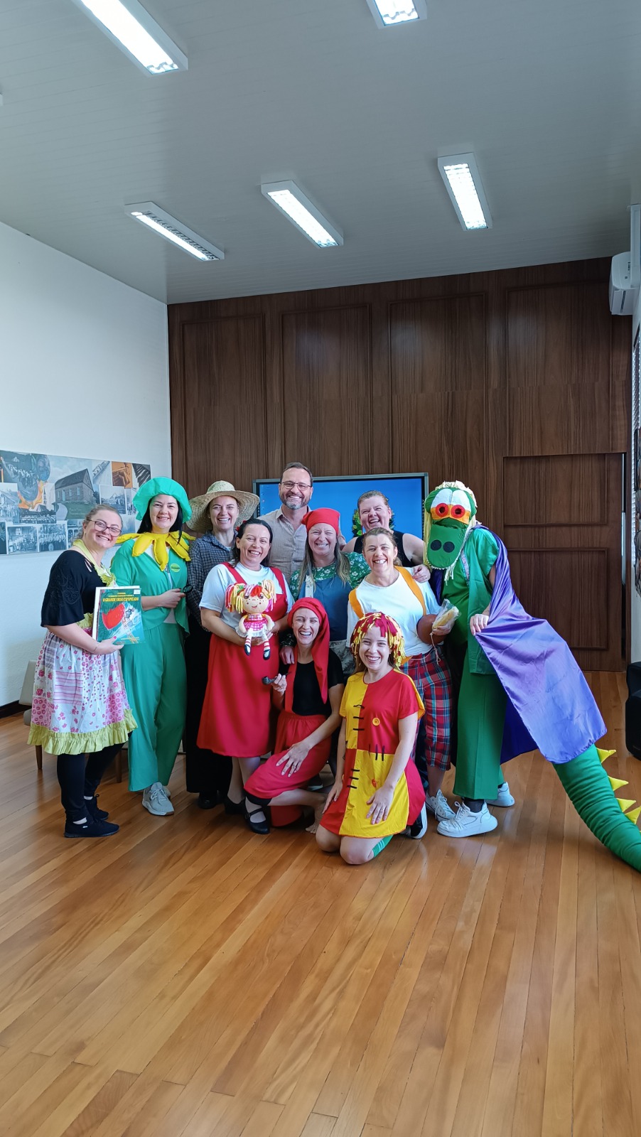 A ação teve como destaque uma visita surpresa à Secretaria Municipal de Educação e também no prédio da Prefeitura de Timbó, onde professoras caracterizadas como personagens do universo do escritor Monteiro Lobato encantaram os servidores com uma performance lúdica e inspiradora.