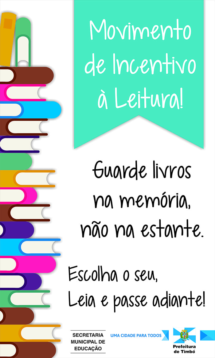 A Secretaria Municipal Educação de Timbó lança nesta semana o Movimento de Incentivo à Leitura, aderindo a um movimento mundial. Ele também é alusivo ao dia 18 de abril (Dia Nacional do Livro Infantil) e ao dia 23 de abril (Dia Mundial do Livro). No município este movimento consiste na participação dos alunos em campanhas realizadas nas escolas, como o projeto Gentileza Gera Gentileza, da Escola Municipal Nestor Margarida e também da Academia de Letras do Brasil, seccional Timbó, na campanha Leia-me, Liberte-me.