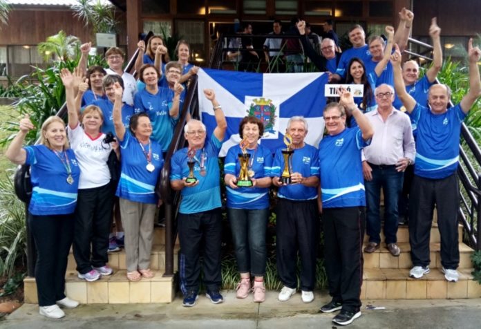 A delegação da Melhor Idade timboense no 12º JASTI contou com a participação de 15 atletas e com o apoio da Prefeitura de Timbó, através da Secretaria de Saúde e Assistência Social e da Fundação Municipal de Esportes, FME.