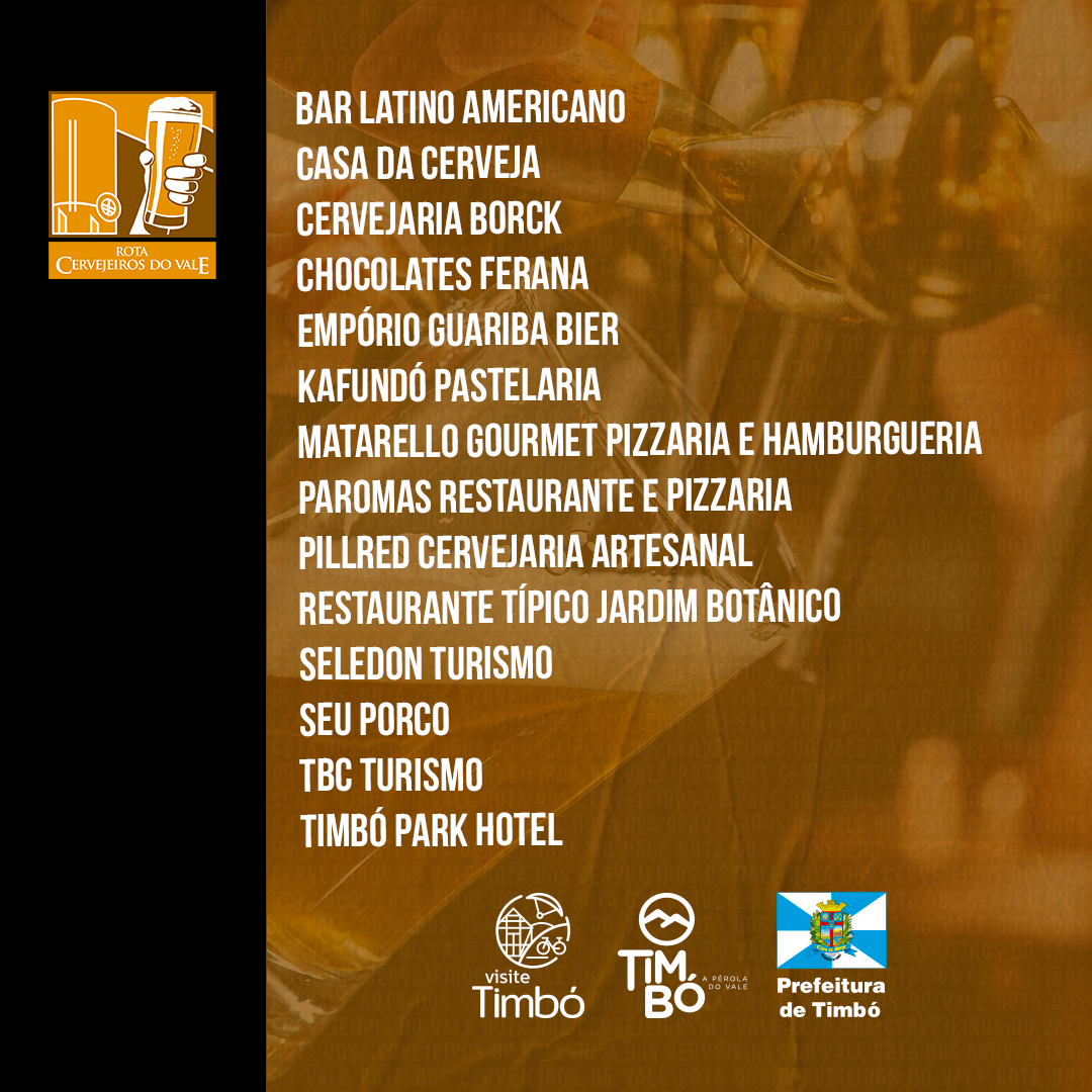 A cidade de Timbó faz parte do Roteiro ‘Cervejeiros do Vale’, lançado em novembro pelo setor de Turismo e Cultura do Consórcio Intermunicipal do Médio Vale do Itajaí (CIMVI). O roteiro é composto por estabelecimentos que envolvem cervejarias artesanais, hospedagens, restaurantes e operadoras de turismo da região.