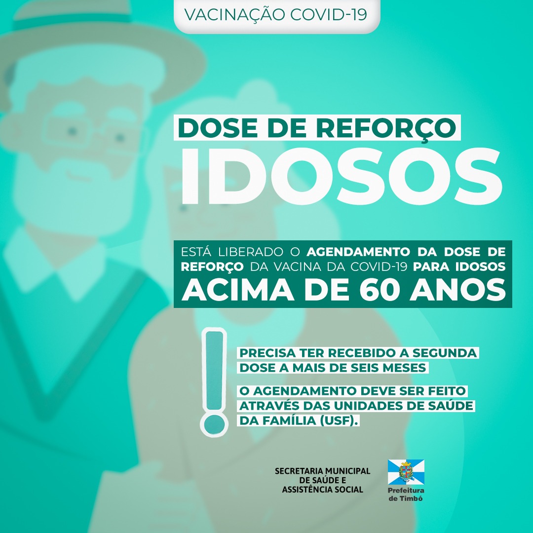 A Secretária de Saúde de Timbó informa que está liberado para agendamento a dose de reforço da vacina contra Covid-19 para idosos a partir dos 60 anos, que receberam a segunda dose há mais de seis meses.