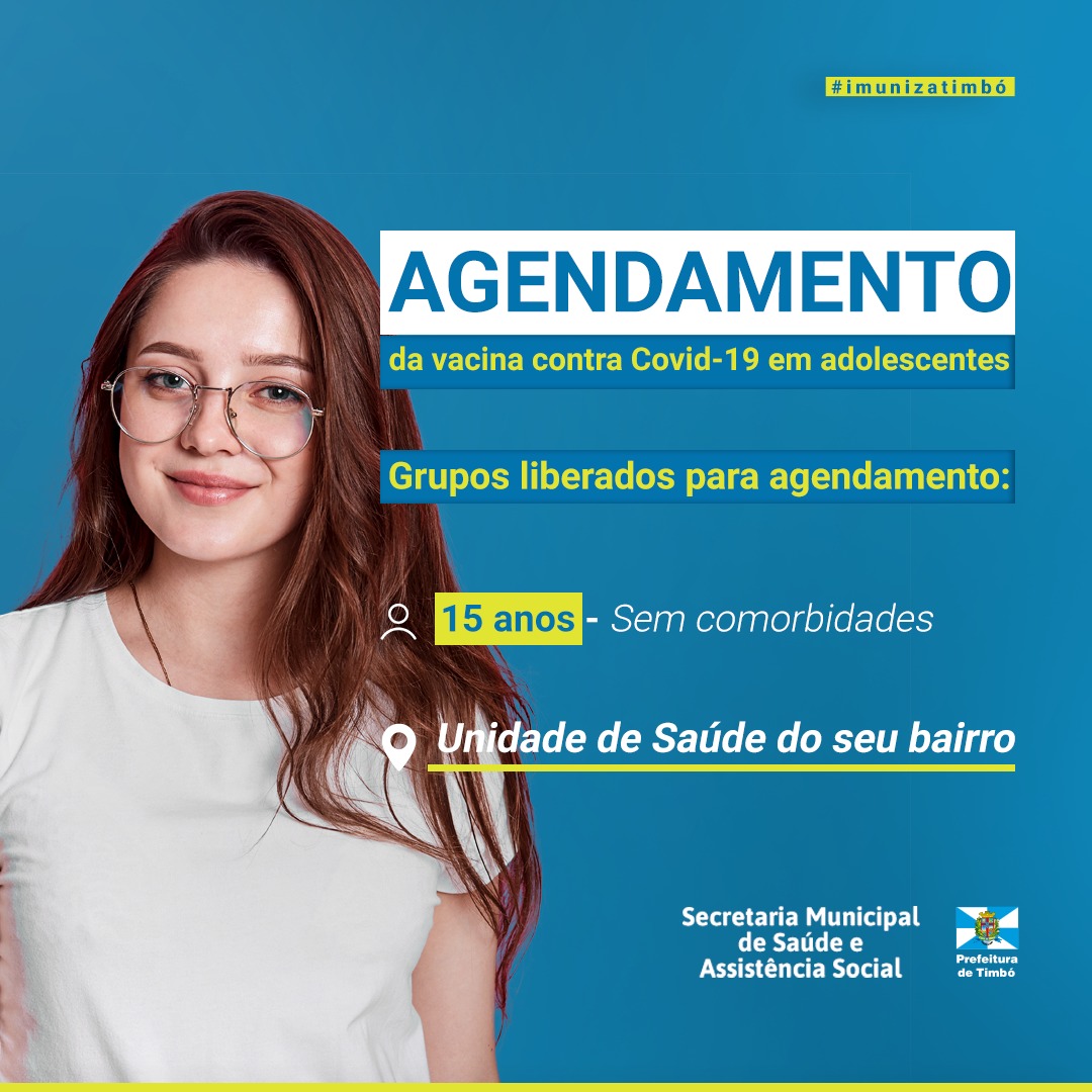 A Secretaria de Saúde informa que iniciou o agendamento da vacina contra Covid-19 em adolescentes com 15 anos.