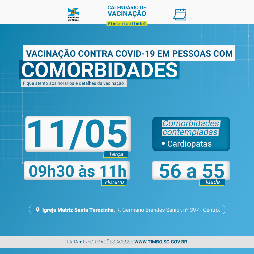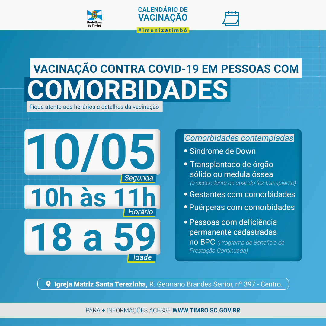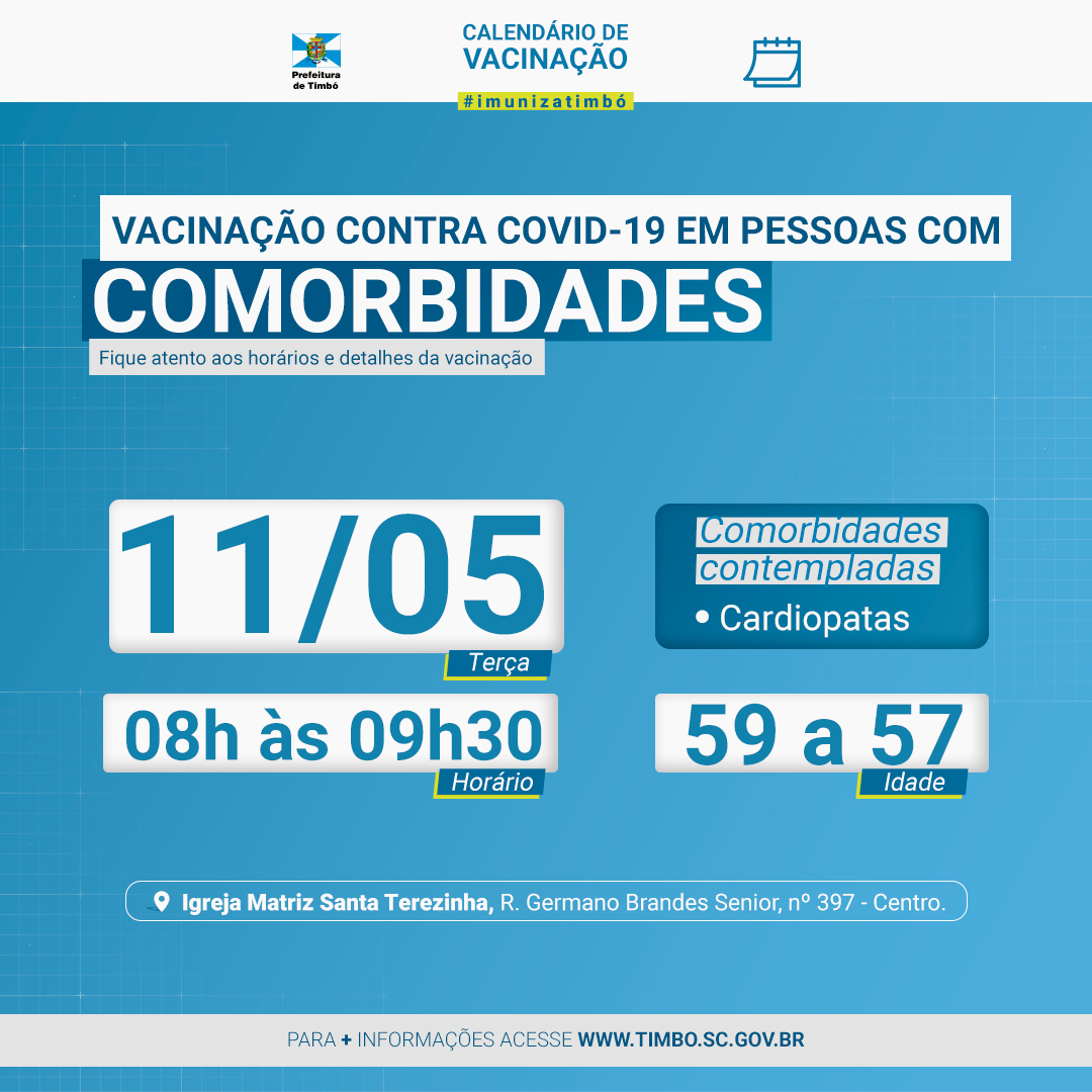 A Secretaria de Saúde informa que na próxima semana irá iniciar a vacinação contra Covid-19 em pessoas com comorbidades. Para respeitar os protocolos de segurança e não gerar aglomeração, foi feita uma divisão entre faixas etárias e comorbidades em diferentes dias e horários.