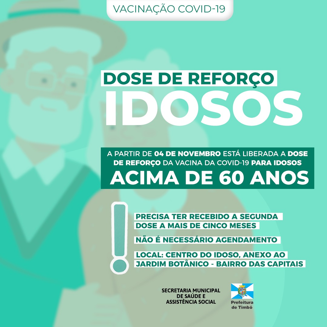 A Secretária de Saúde de Timbó informa que está liberada a partir da quinta-feira, dia 04 de novembro, a dose de reforço da vacina contra Covid-19 para idosos a partir dos 60 anos, que receberam a segunda dose há mais de cinco meses.
