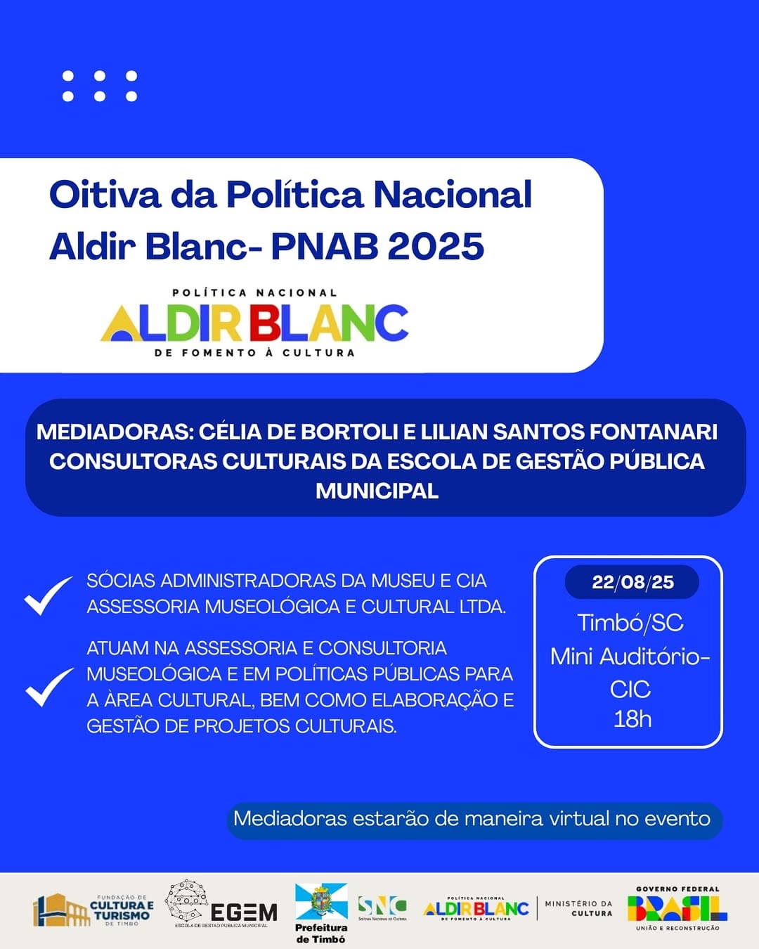 A Prefeitura de Timbó promove, nesta sexta-feira, dia 22, às 18h, no Centro Integrado de Cultura, a oitiva pública da Política Nacional Aldir Blanc (PNAB) 2025. O encontro é de graça, aberto à comunidade e tem como objetivo dialogar sobre a aplicação dos recursos destinados à cultura no município.
