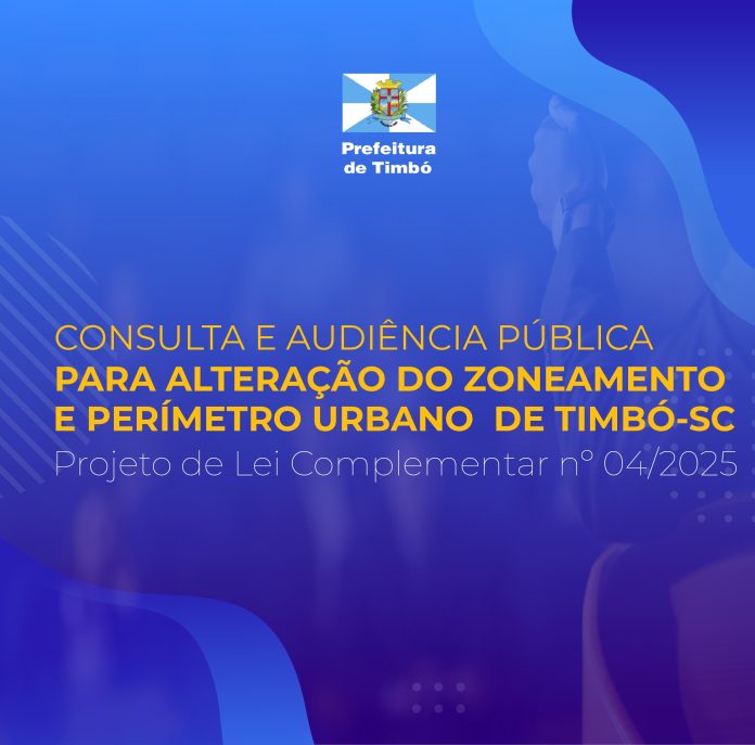 A Prefeitura de Timbó, por meio da Secretaria de Planejamento, Trânsito, Meio Ambiente, Indústria, Comércio e Serviços, em conjunto com a Câmara Municipal e o Conselho da Cidade, convoca a população para participar da Audiência Pública/Conferência da Cidade, que ocorrerá no dia 08 de maio de 2025, às 18h, no Plenário da Câmara Municipal.