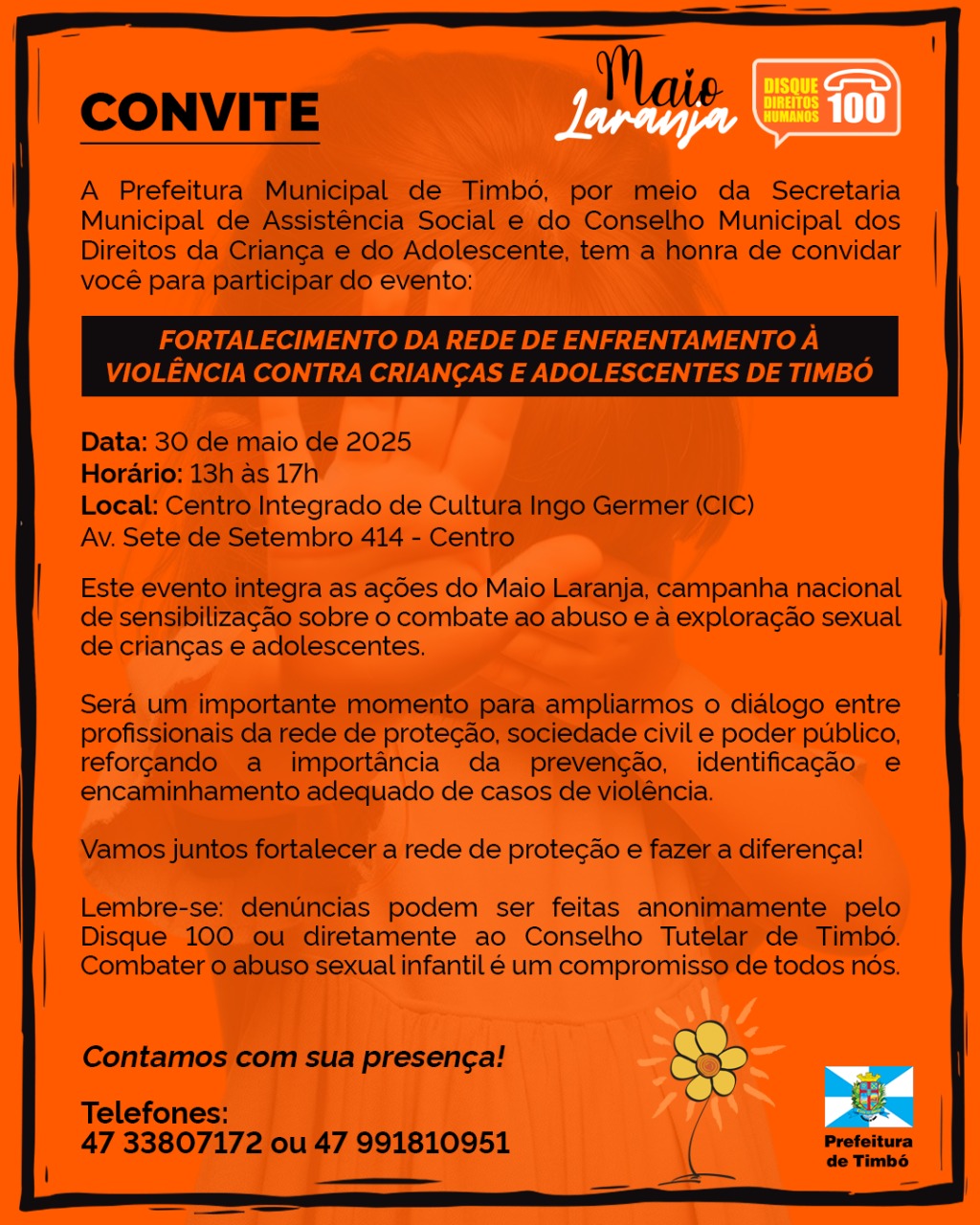 Em adesão a sensibilização nacional, Maio Laranja, o município de Timbó, por meio da Secretaria Municipal de Assistência Social e Conselho Municipal dos Direitos da Criança e do Adolescente , promove uma palestra direcionada para profissionais que atuam diretamente no setor sobre o combate ao abuso e à exploração sexual de crianças e adolescentes.