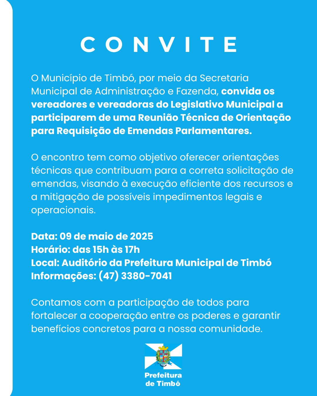 O município de Timbó, por meio da Secretaria Municipal da Fazenda, promove na próxima sexta-feira, dia 9 de maio, sobre a solicitação de emendas parlamentares. O encontro será realizado no auditório da Prefeitura, a partir das 15h, e contará com a presença de vereadores e vereadoras do município.