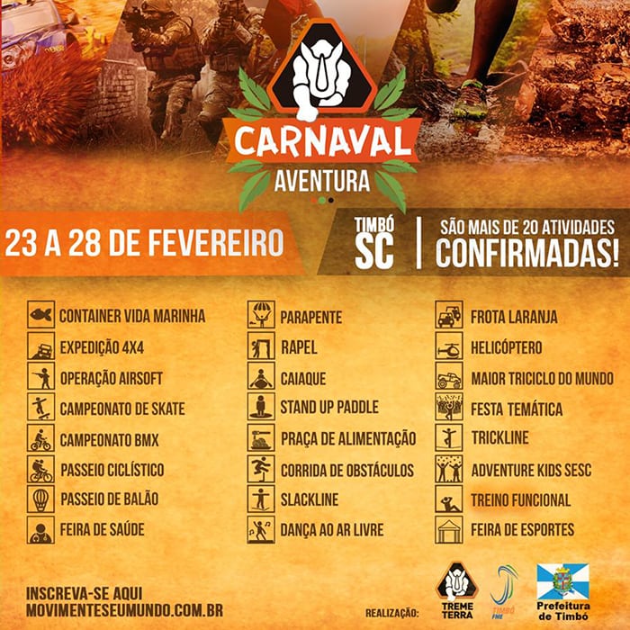Pra quem gosta de aventura e quer fugir do agito do carnaval, Timbó é o destino certo. De 23 a 28 de fevereiro, no Pavilhão de Eventos Henry Paul, acontece o Carnaval Aventura, realizado pela empresa Treme Terra, com apoio da Prefeitura de Timbó. Serão mais de 20 atrações e modalidades esportivas, entre elas: Corrida com Obstáculo, Campeonato de Skate, Campeonato de BMX, Revoada de Parapente (realizada no Morro Azul), Expedição 4×4, Passeio de Balão, Caiaque, Passeio Ciclístico, Cãominhada, Treino Funcional, e muito mais. Para saber mais sobre o evento, é só entrar no site www.movimenteseumundo.com.br ou através do telefone (47) 99248-4219.