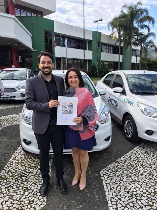 O Prefeito Jorge Kruger e a secretária de Saúde e Assistência Social de Timbó, Deise Adriana Nicholletti Mendes, receberam nesta semana, em Florianópolis, um veículo modelo FORD KA sedan. Ele foi entregue pela Secretaria de Estado, Trabalho e Habitação, em reconhecimento do trabalho realizado pelo município, na erradicação da extrema pobreza. O município realiza um atendimento especializado à população em vulnerabilidade social, na garantia de seus direitos sociais.