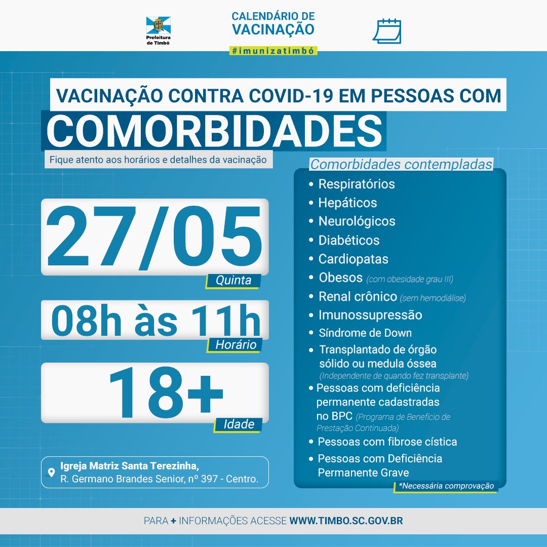A Secretaria de Saúde informa que nesta quinta-feira, dia 27, irá continuar a vacinação contra Covid-19 em pessoas a partir dos 18 anos com comorbidades.