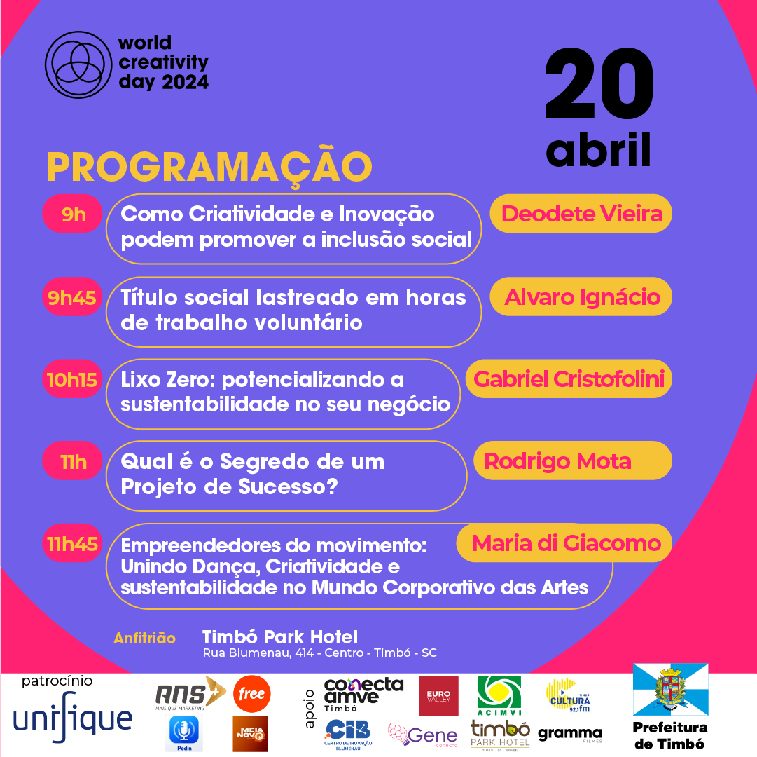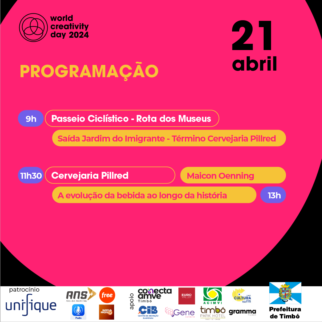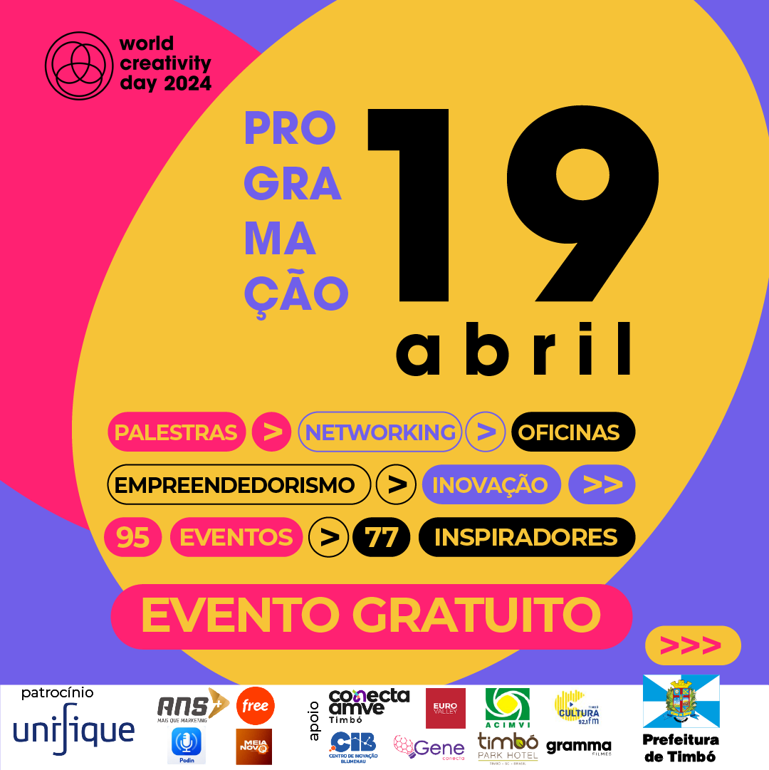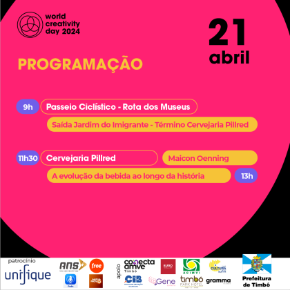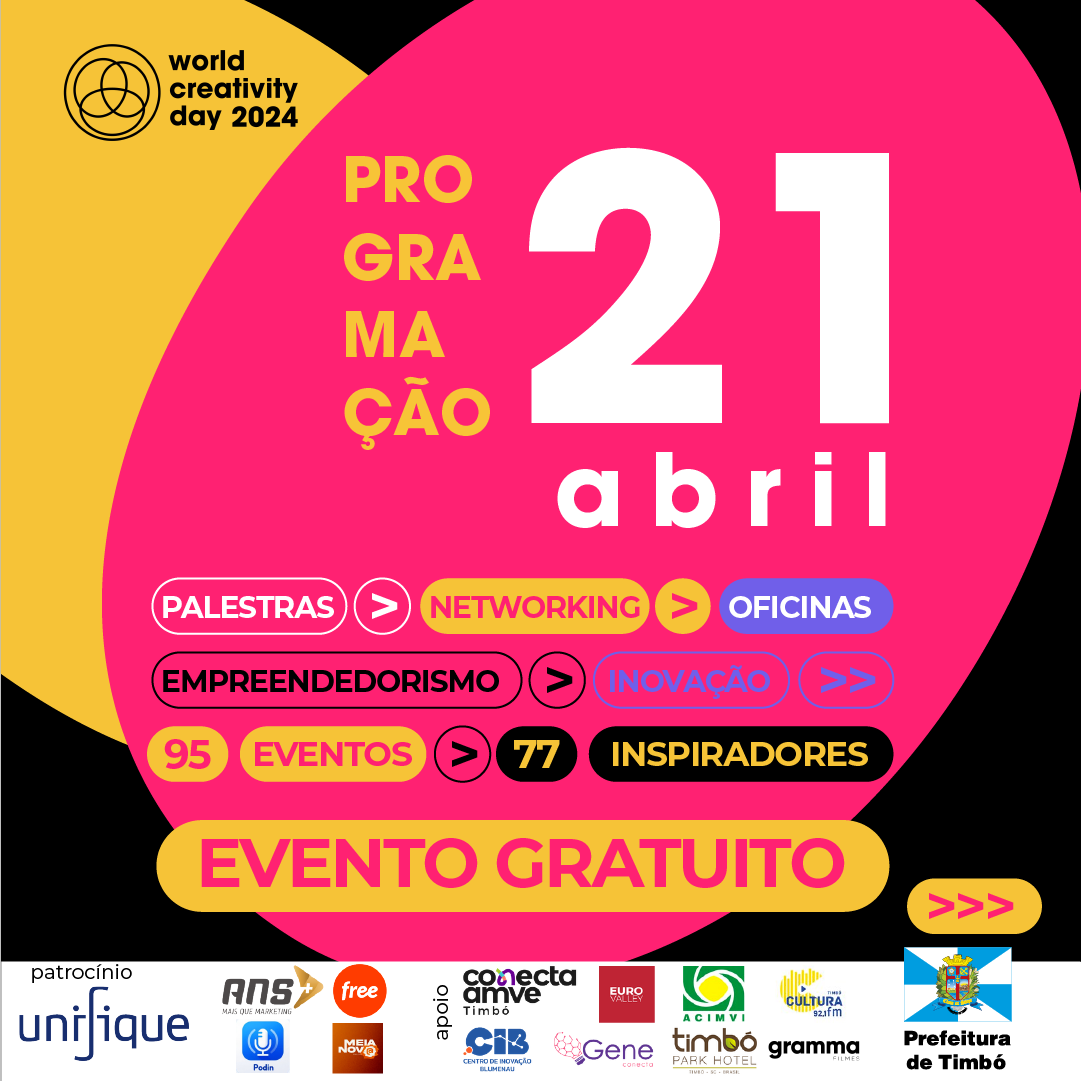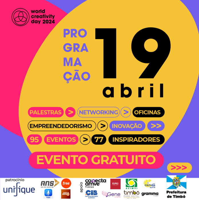 Entre os dias 19 e 21 de abril, Timbó participa da programação do movimento global do Dia Mundial da Criatividade. O município é o único da região do Vale Europeu que irá sediar o evento.