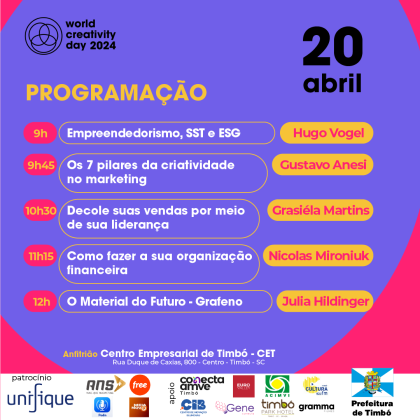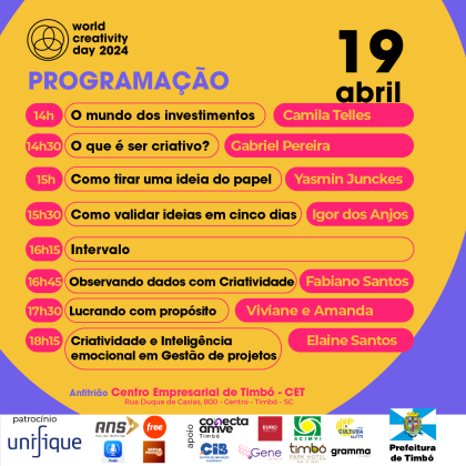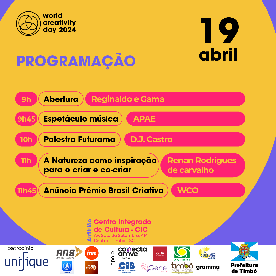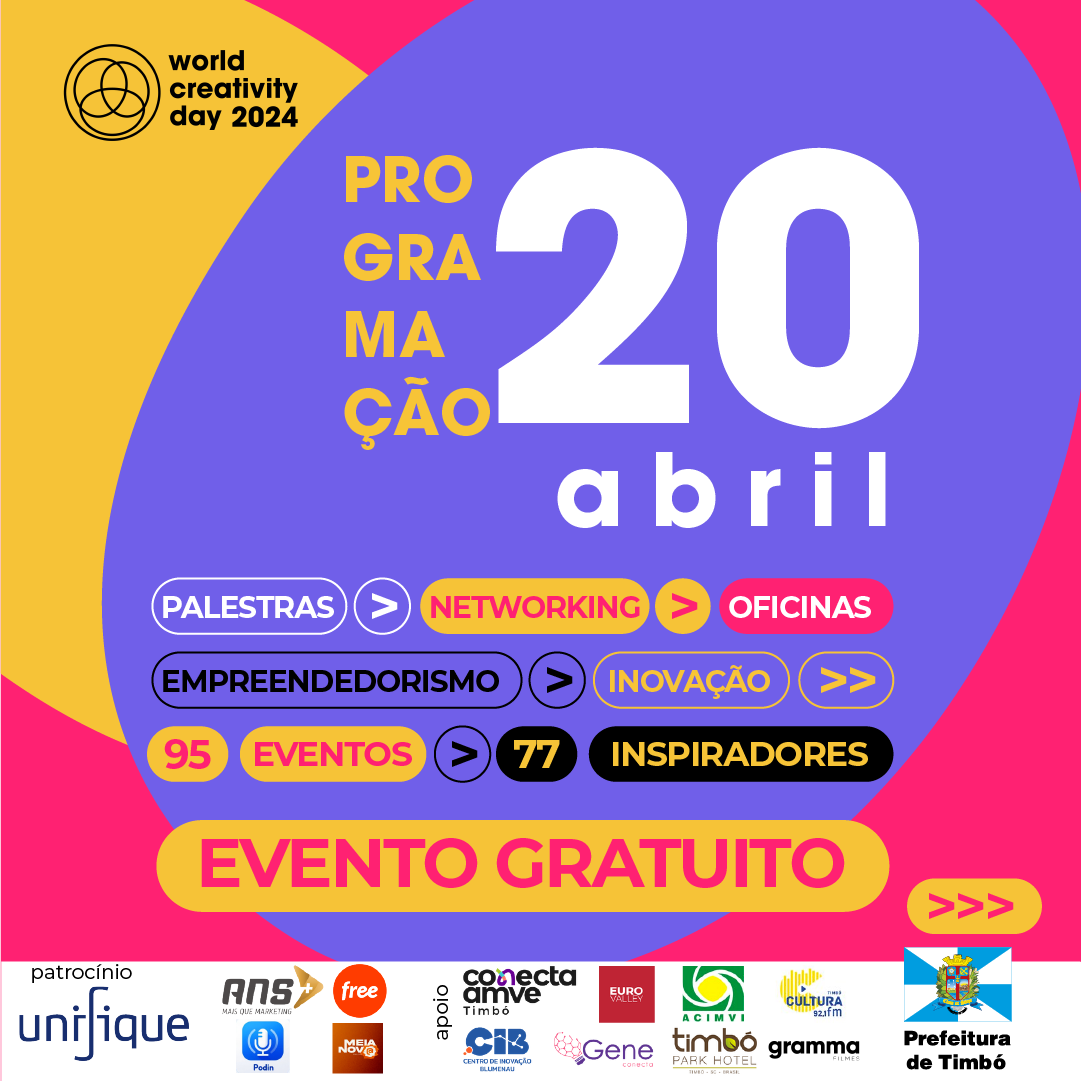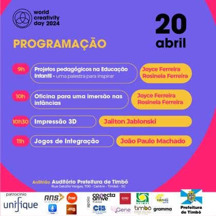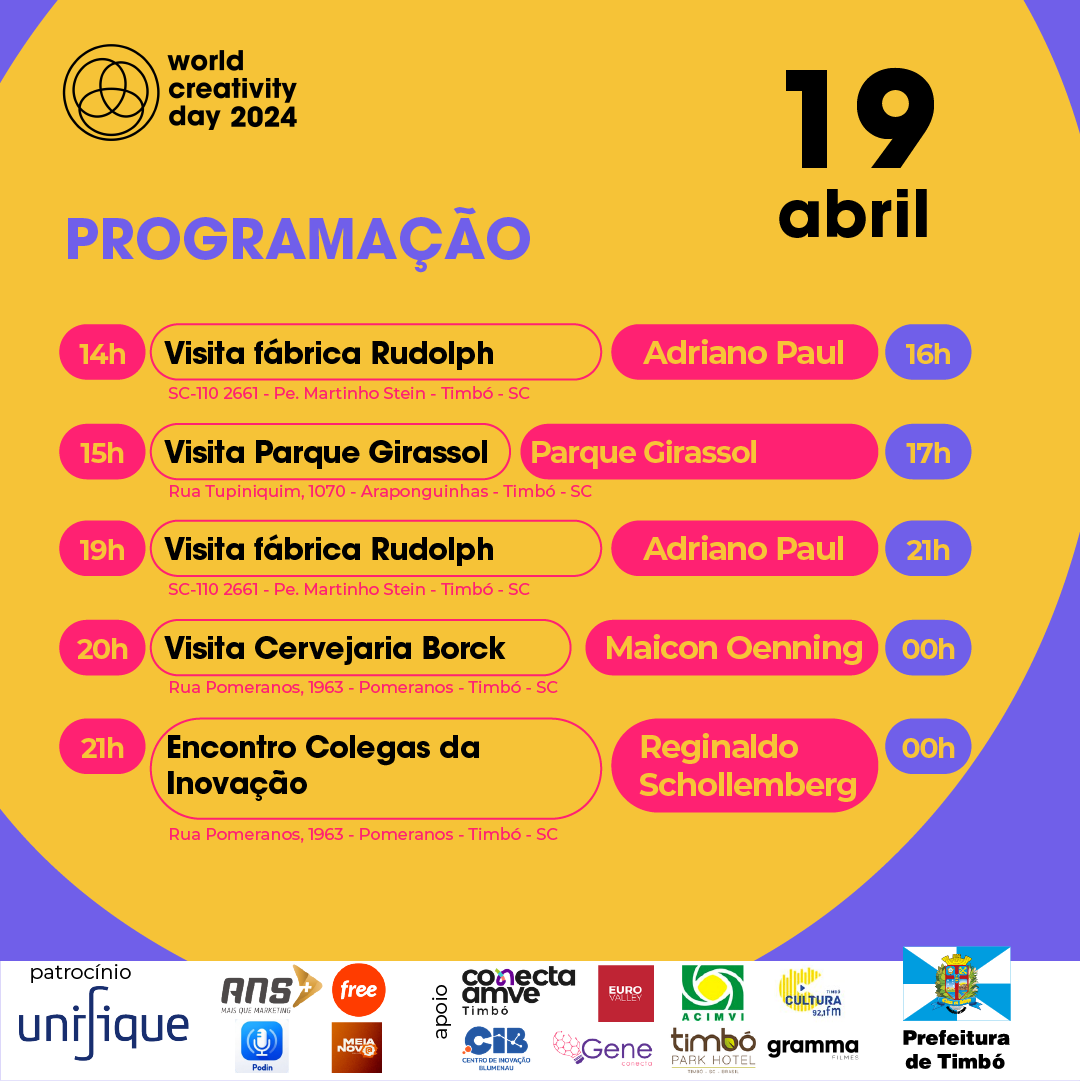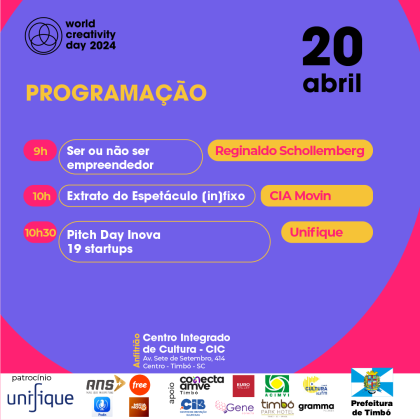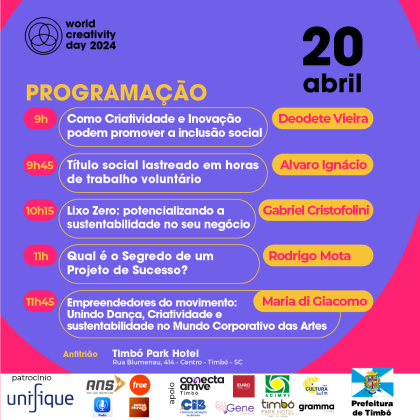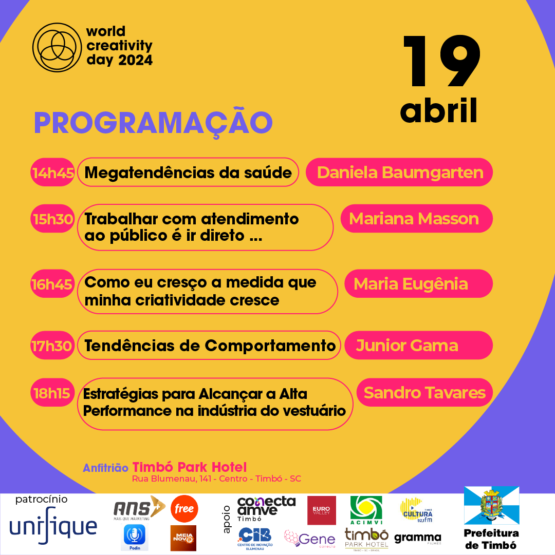 Entre os dias 19 e 21 de abril, Timbó participa da programação do movimento global do Dia Mundial da Criatividade. O município é o único da região do Vale Europeu que irá sediar o evento.