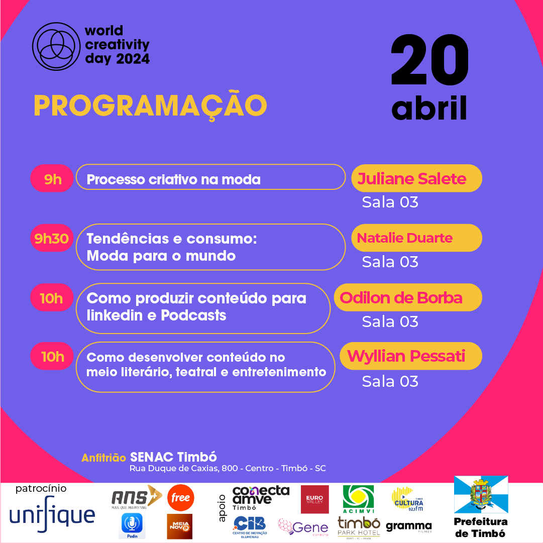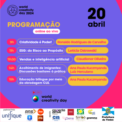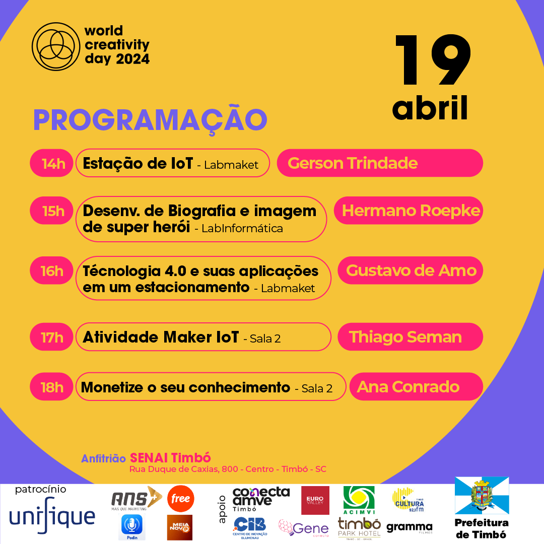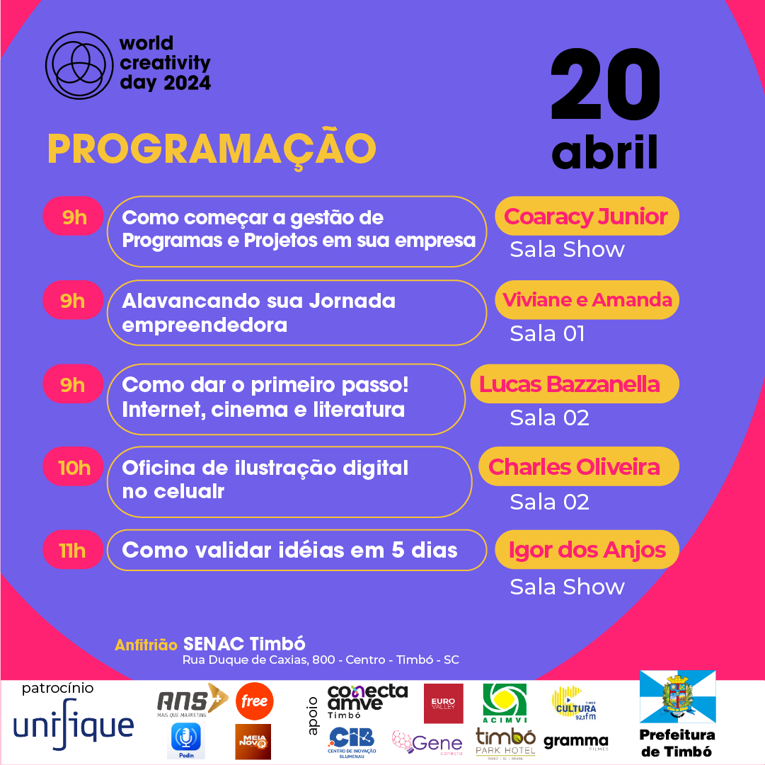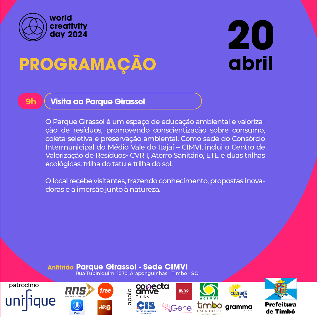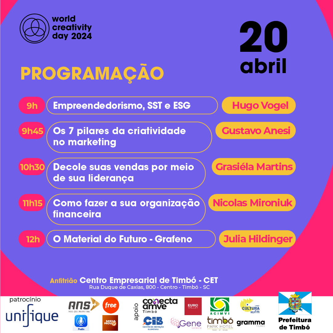 Entre os dias 19 e 21 de abril, Timbó participa da programação do movimento global do Dia Mundial da Criatividade. O município é o único da região do Vale Europeu que irá sediar o evento.