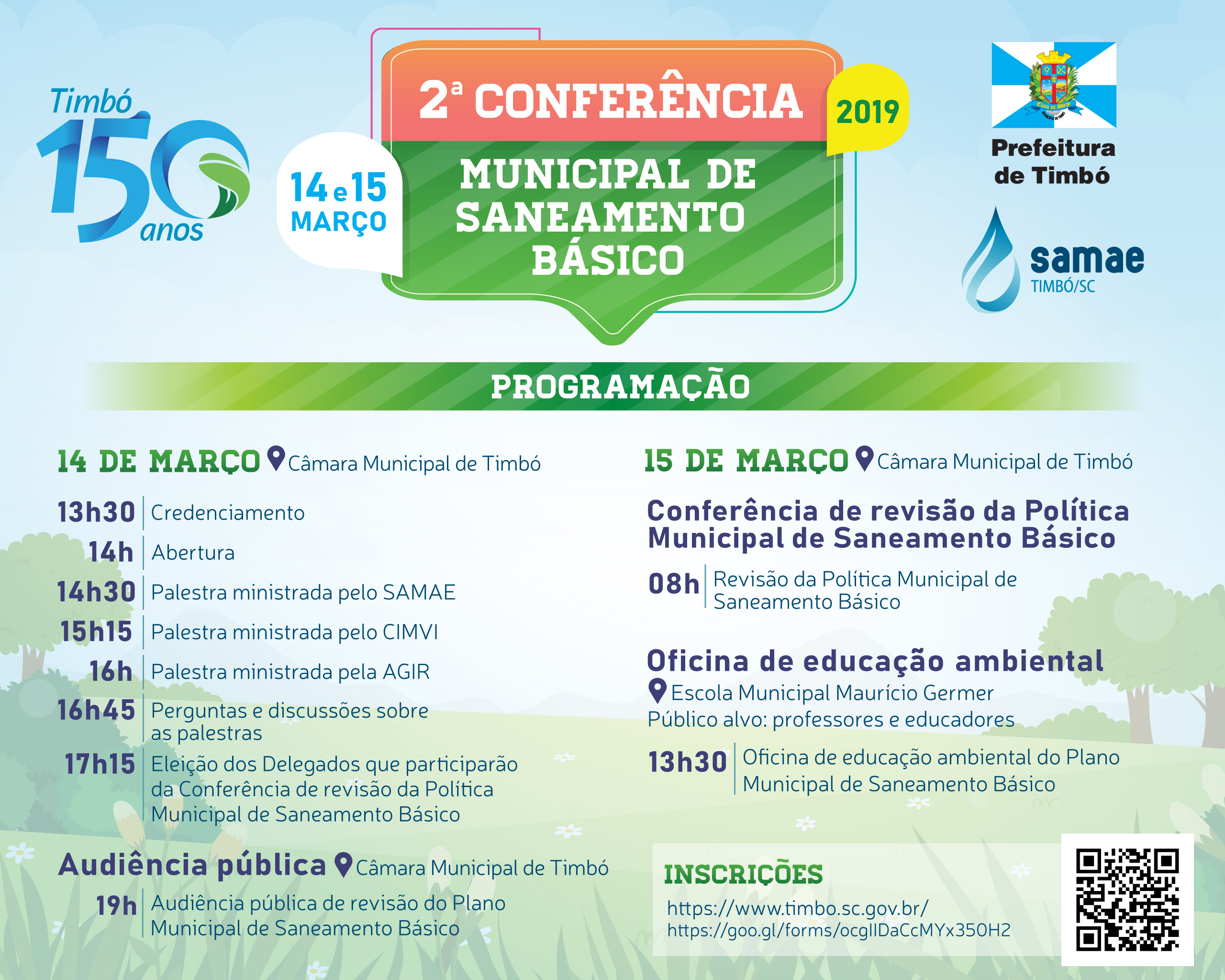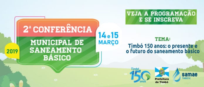 Nos dias 14 e 15 de março, acontece no plenário da Câmara Municipal de Vereadores de Timbó a 2ª Conferência Municipal de Saneamento Básico, com o tema “Timbó 150 anos: o presente e o futuro do saneamento básico”. A Conferência irá discutir questões relacionadas ao saneamento básico – abastecimento de água, esgotamento sanitário, drenagem urbana, e gestão de resíduos sólidos – e será aberta a participação da comunidade.
