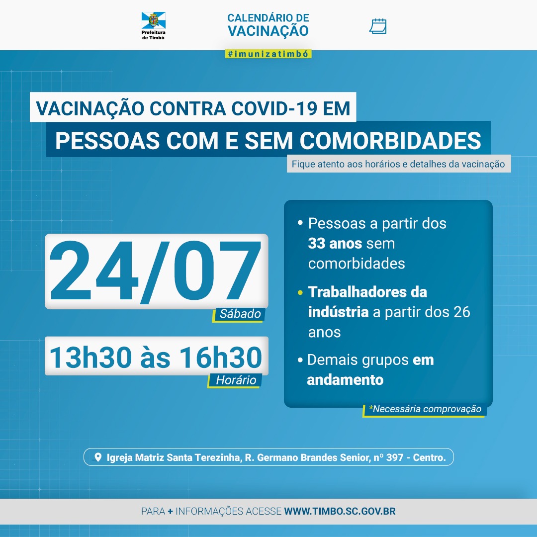 Já no sábado, dia 24, é a vez das pessoas a partir dos 33 anos e trabalhadores da indústria a partir dos 26 anos serem vacinados. No sábado o horário de vacinação é das 13h30 às 16h30.