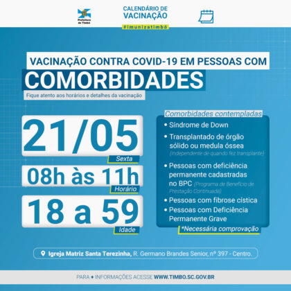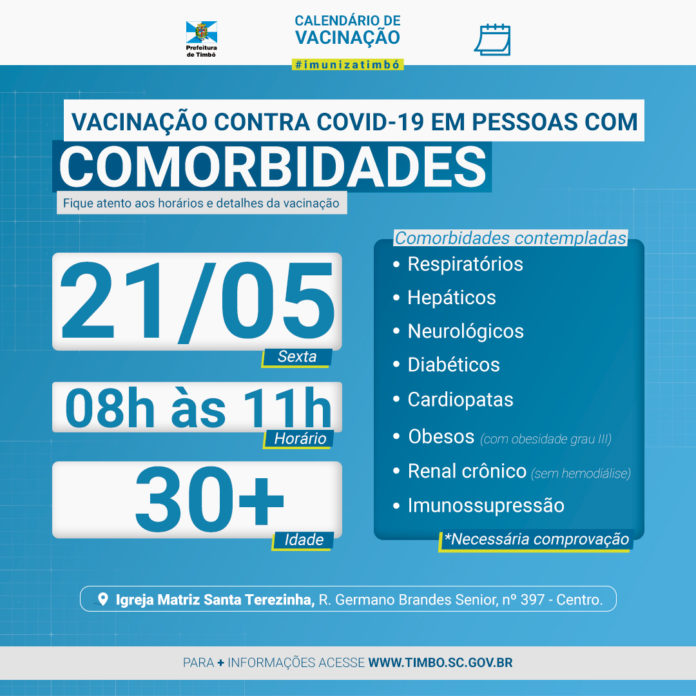 A Secretaria de Saúde informa que nesta sexta-feira, dia 21, irá abrir vacinação contra Covid-19 para pessoas a partir dos 30 anos com comorbidades.