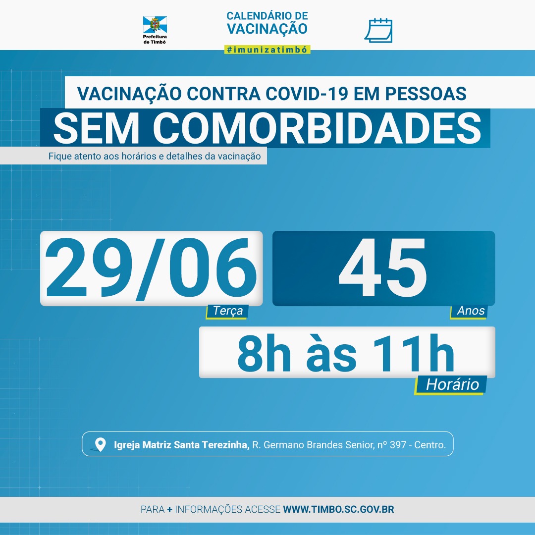 A Secretaria de Saúde de Timbó informa que nesta terça-feira, dia 29 de junho, pessoas a partir dos 45 anos serão vacinadas contra a Covid-19.