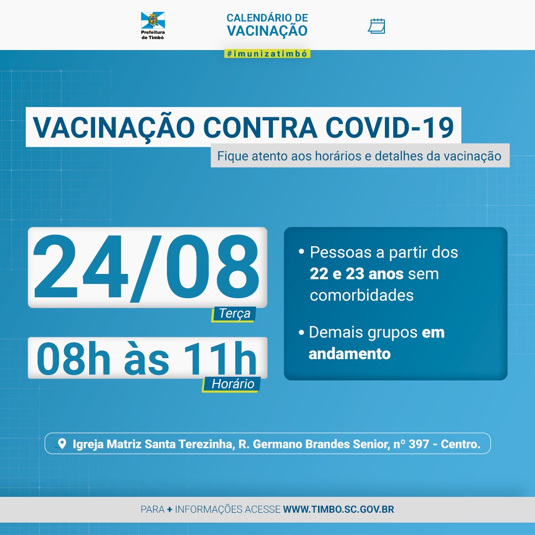 A Secretaria de Saúde informa que na terça-feira, dia 24 de agosto, irá vacinar contra Covid-19 pessoas a partir dos 22 e 23 anos.