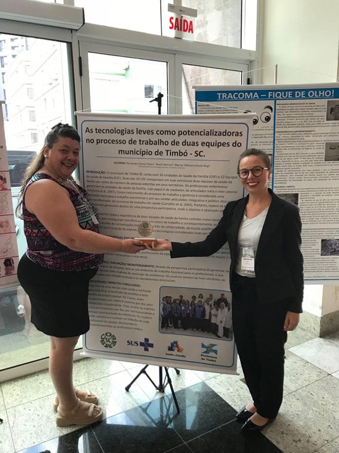 A Unidade de Saúde da Família Solidária, situada no bairro das Capitais, teve seu trabalho premiado no 67º Congresso do Conselho das Secretarias Municipais de Saúde de Santa Catarina – COSEMS SC, ocorrido em Joinville, entre os dias 28 e 30 de novembro. Intitulado As tecnologias leves como potencializadoras no processo de trabalho de duas equipes no município de Timbó, foi um dos 21 do estado de Santa Catarina, escolhidos para participar da Mostra Brasil Aqui Tem SUS, ocorrida em Brasília e promovida pela parceria entre CONASEMS (Conselho Nacional das Secretarias de Saúde) e COSEMS, em meados deste ano. O trabalho relata a experiência das duas equipes atuantes naquela Unidade de Saúde sobre a utilização das tecnologias leves (escuta, diálogo) para a melhora do processo de trabalho, contribuindo para um atendimento humanizado e qualificado aos usuários.