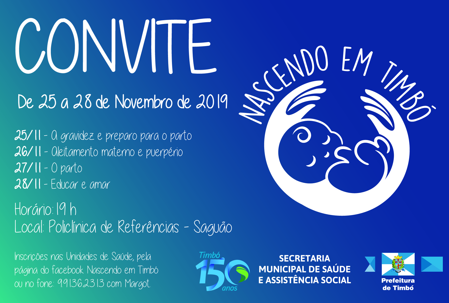 Para melhor organização do evento é importante que os interessados realizem suas inscrições, que podem ser feitas pelo facebook do Nascendo em Timbó (https://bit.ly/34QAt2e), Nas Unidades de Saúde do município ou pelo telefone/whatsapp da coordenadora do programa, enfermeira Margot Friedmann Zetsche, 47 99136-2313.