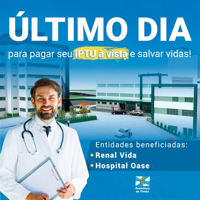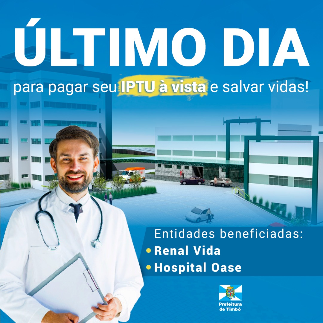 A campanha do IPTU de Timbó neste ano continua para duas causas muito importantes. O desconto de 10% dos pagamentos à vista será revertido metade para o Hospital e Maternidade OASE e para a Renal Vida, que também realiza um trabalho de excelência ajudando a salvar vidas e precisa da comunidade para dar início à construção de sua nova sede!