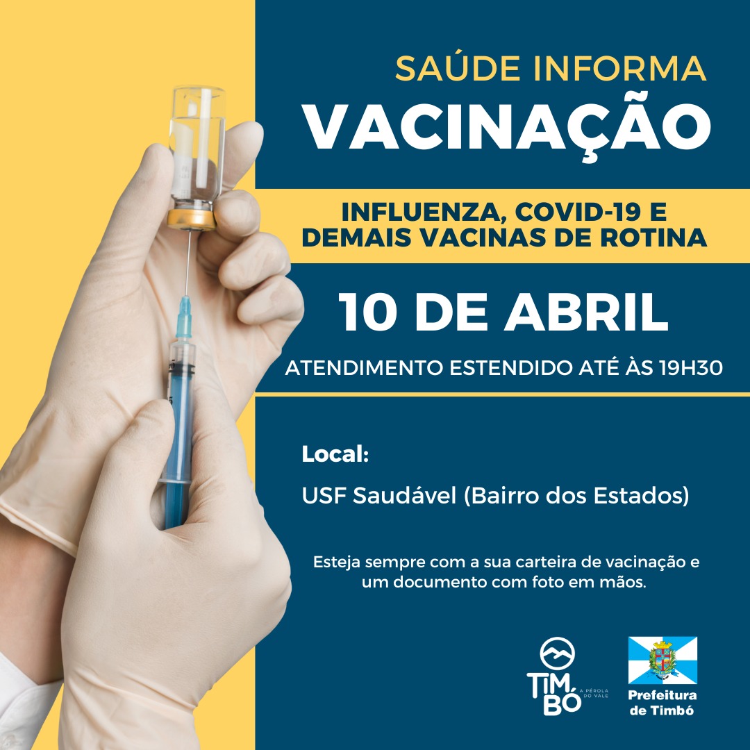 A Secretaria de Saúde de Timbó informa que nesta quarta-feira, dia 10 de abril, a Unidade de Saúde Saudável, do Bairro dos Estados, terá horário de atendimento estendido para aplicação das vacinas da Influenza, Covid-19 e demais vacinas de rotina, para todas as idades.