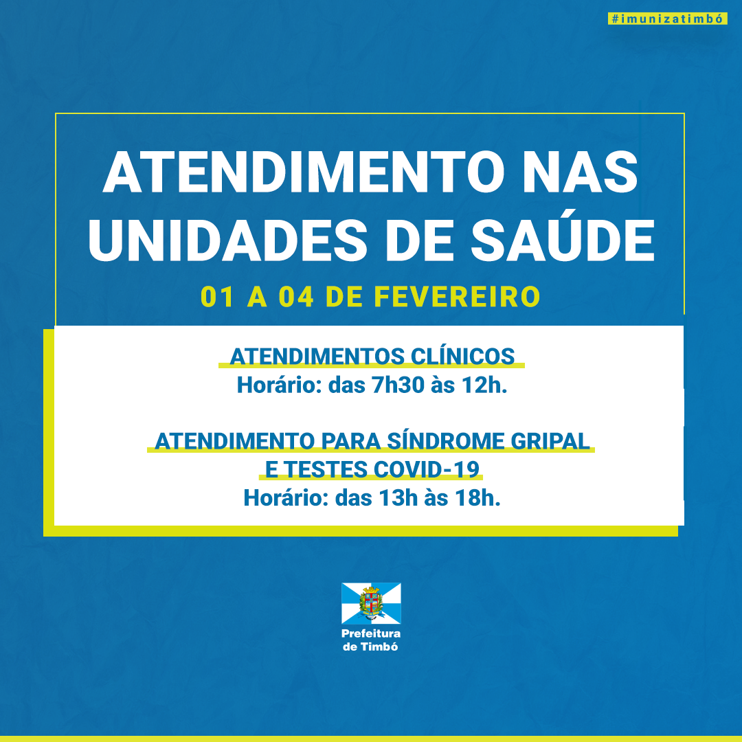 A Secretaria de Saúde de Timbó informa que a partir desta terça-feira, 01 de fevereiro, terá uma mudança no horário de atendimento à Covid-19 nas Unidades de Saúde.