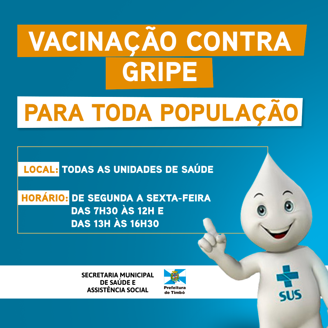 A Secretaria de Saúde de Timbó informa que a vacina contra a Gripe (Influenza) está liberada para toda a população a partir dos 6 meses de idade.