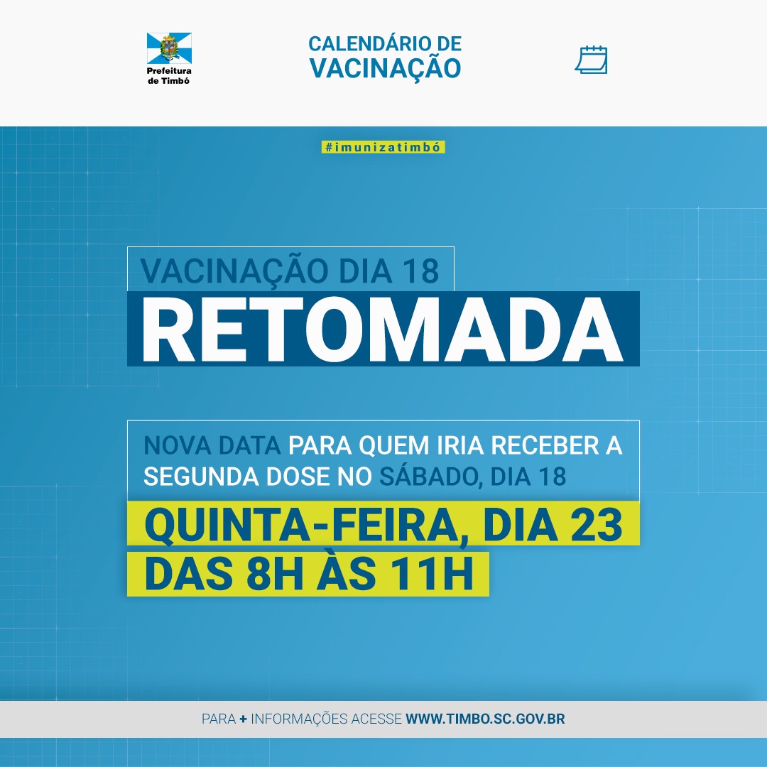 A Secretaria de Saúde de Timbó informa que recebeu as doses da vacina Astrazeneca para seguir a aplicação de segundas doses programadas. Quem deveria ter tomado a segunda dose no último sábado, dia 18, deve ir nesta quinta-feira, dia 23, das 8h às 11h.