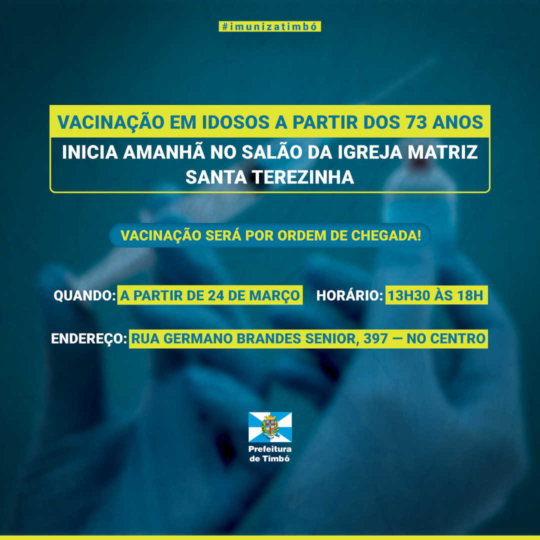 A Prefeitura de Timbó, através da Secretaria de Saúde, informa que recebeu mais mil doses da vacina contra a Covid-19 e a partir de amanhã, 24 de março, inicia a aplicação da primeira dose em idosos a partir dos 73 anos. Prezando pela segurança de todos, a vacinação irá acontecer das 13h30min às 18h no Salão da Igreja Matriz Santa Terezinha, localizada na Rua Germano Brandes Senior, número 397, no Centro.