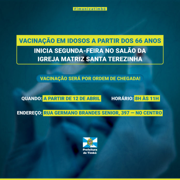 A Secretaria de Saúde de Timbó informa que recebeu mais 380 doses de vacina contra a Covid-19, que vão ser aplicadas nesta segunda-feira, 12 de abril, em idosos a partir dos 66 anos.
