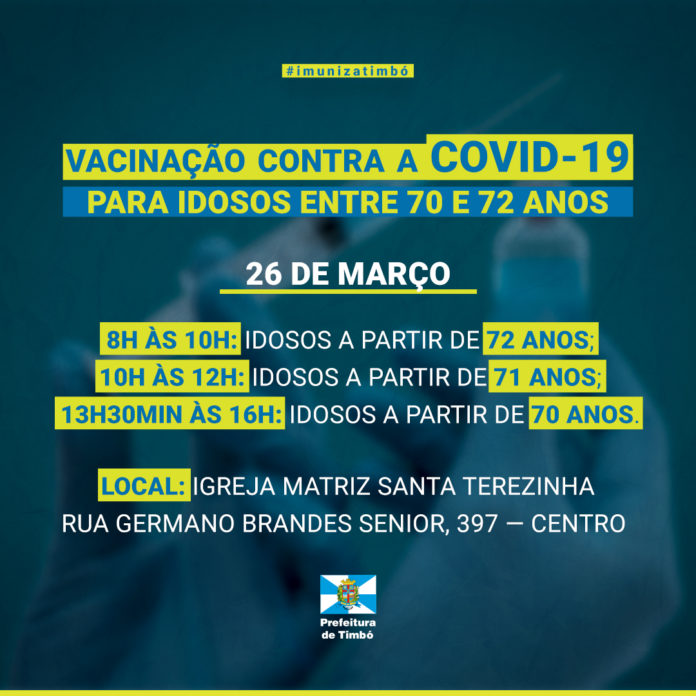 A Secretaria de Saúde de Timbó informa que 525 doses de vacina contra a Covid-19 foram aplicadas, em idosos a partir dos 73 anos, no mutirão realizado pela Secretaria de Saúde nessa quarta-feira, 24 de março.
