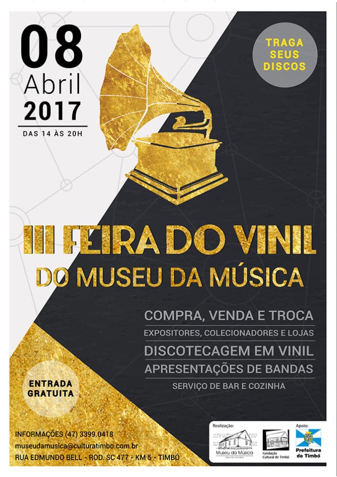 Sábado, dia 08 de abril, acontece mais uma edição da Feira de Vinil do Museu da Música de Timbó. Música, vinis, exposições, brechó e um completo serviço de bar e cozinha te esperam a partir das 14h. A Feira do Vinil tem como principal objetivo a troca de informações entre as gerações que conviveram com os LPs e as que nasceram na era digital, mas que estão podendo ver o renascimento da cultura dos discos. O evento contará com diversos expositores com venda e troca de vinis, apresentações das bandas Slow Train, Junior Sofiati e Johnny’s Garden, além da discotecagem de vinil (na área interna do Museu) dos Djs Giba Moura e Rafael Barros. Além disso, para os pequenos, haverá tenda com ações lúdicas ministradas pela educadora do Museu da Música. A entrada é gratuita.