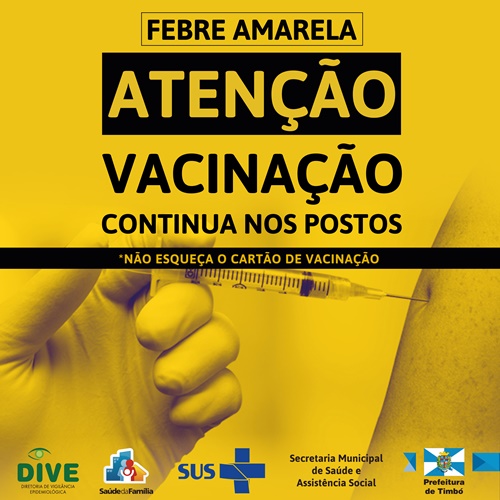 A campanha de conscientização para vacinação contra Febre amarela em Timbó conseguiu imunizar 93,34% do total de pessoas, que estavam dentro da faixa etária preconizada, até o início deste ano. Ainda há um residual de 2.208 pessoas que precisam tomar a vacina, neste grupo há desde crianças a partir de 9 meses até adultos com 59 anos.