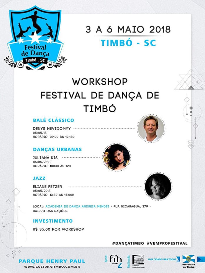 Os mais de 1600 bailarinos que circulam por Timbó neste final de semana terão a oportunidade de se aperfeiçoar. Quatro workshops integram a programação do 18º Festival de Dança de Timbó e são abertos também à comunidade. Sábado, dia 05, acontecem na Academia de Dança Andreia Mendes os workshops de Balé Clássico, Danças Urbanas e Jazz, ministrados por profissionais que integram a comissão julgadora do Festival. O investimento é de R$ 35 por participação, e as inscrições podem ser feitas no local. Já no domingo, dia 06, o Parque Central recebe o workshop gratuito FIH2, Festival Internacional de Hip Hop, com foco em danças urbanas. A idade mínima para fazer parte dos workshops é de 12 anos, e toda a comunidade pode participar.