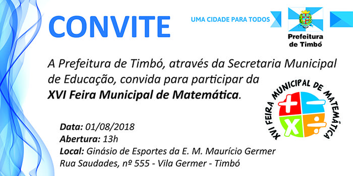 A Prefeitura de Timbó, através da Secretaria Municipal de Educação, promove no dia 1º de agosto a XVI Feira Municipal de Matemática. O evento acontecerá na Escola Municipal Maurício Germer, com abertura oficial às 13h, e reunirá 19 trabalhos de unidades de educação municipais, estaduais e particulares de diversos níveis de ensino de Timbó. A Feira Municipal de Matemática tem o objetivo de possibilitar a troca de experiências entre estudantes e professores, incentivando pesquisas e atividades matemáticas.